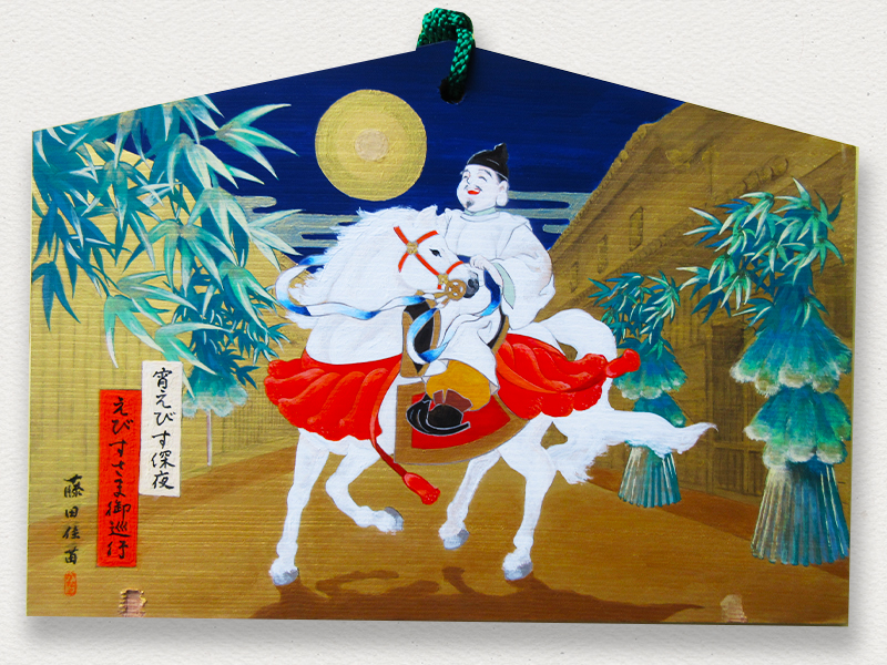 市中を巡行されるえびすさま当社の門前町では、古くより十日えびすの宵宮の9日の夜、各家の門口に立ててある門松の枝を逆さにつけかえ、静かに神様をお迎えする風習がありました。昔の門松は、枝葉の付いた大きな斎竹に松を盛り添えて作られており、各家々が通りに面して建てると、通りがせまくなる程であったといわれております。この為、この夜えびすさまが神馬にお乗りになって市中を巡行されるのに、松の葉先があたっては大変、ということで、この様にしたと伝えられています。
