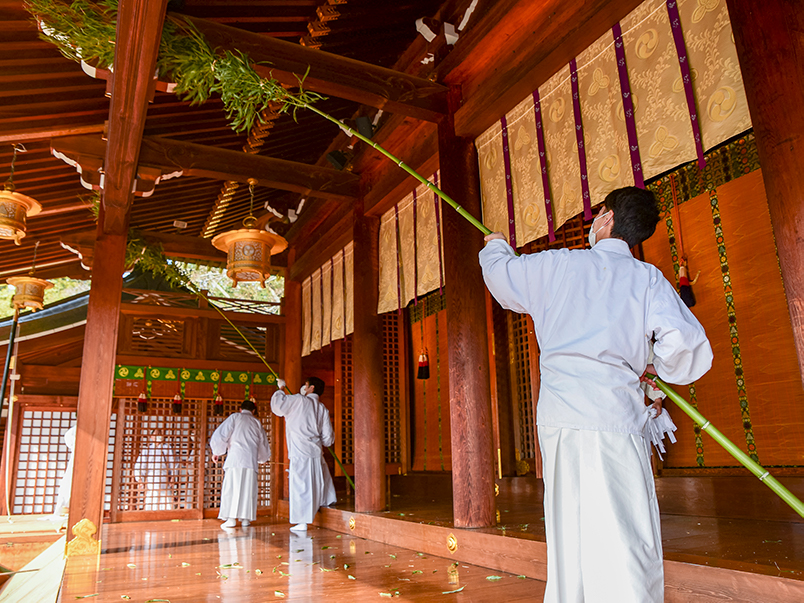 場所:本殿・拝殿 - 新しい年を迎えるにあたり、この1年間の本殿のほこりを落す年末恒例の煤払いを行います。午前10時から本殿で今年の無事安泰に感謝をする祭を斎行したあと、神職が白衣袴にマスク姿で笹竹の特製のハタキ等を用い、本殿内部や普段は清められない天井近くの柱や壁などのほこりも落します。